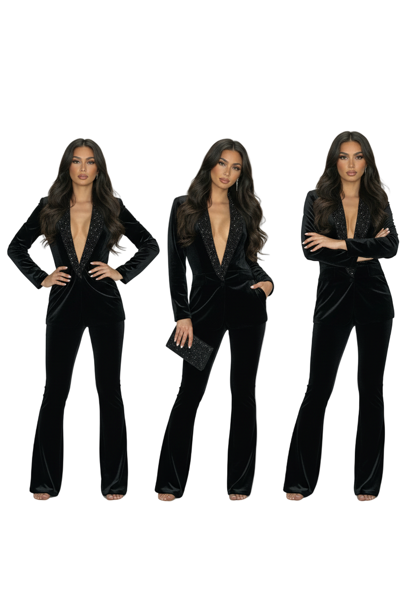 Compleu din catifea neagră, format din sacou elegant și pantaloni evazați, creat pentru femeia modernă care emană încredere și rafinament. Sacoul are un croi cambrat ce evidențiază talia, completat de reverele decorate cu detalii strălucitoare, oferind un contrast glam și sofisticat. Pantalonii evazați alungesc vizual silueta și conferă un plus de eleganță, transformând acest set într-o alegere ideală pentru evenimente speciale, seri elegante sau apariții de gală.