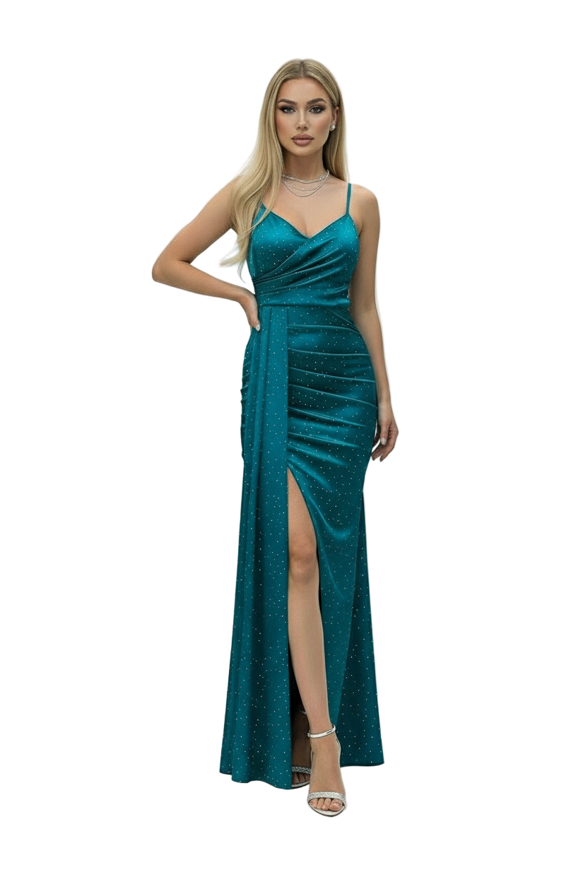Rochie lungă de seară realizată din material elastic cu strasuri fine ce oferă un efect glam și spectaculos. Bretelele subțiri și decolteul în V pun în valoare bustul, iar fronseurile laterale evidențiază silueta. Crăpătura frontală completează designul cu un plus de senzualitate și rafinament, făcând din această rochie alegerea ideală pentru evenimente elegante, gale sau petreceri unde vrei să atragi toate privirile.